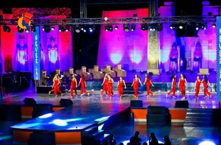 - Mises en scène de l’Égypte antique avec danses sur les thèmes des pharaons, Cléopâtre et Rome.